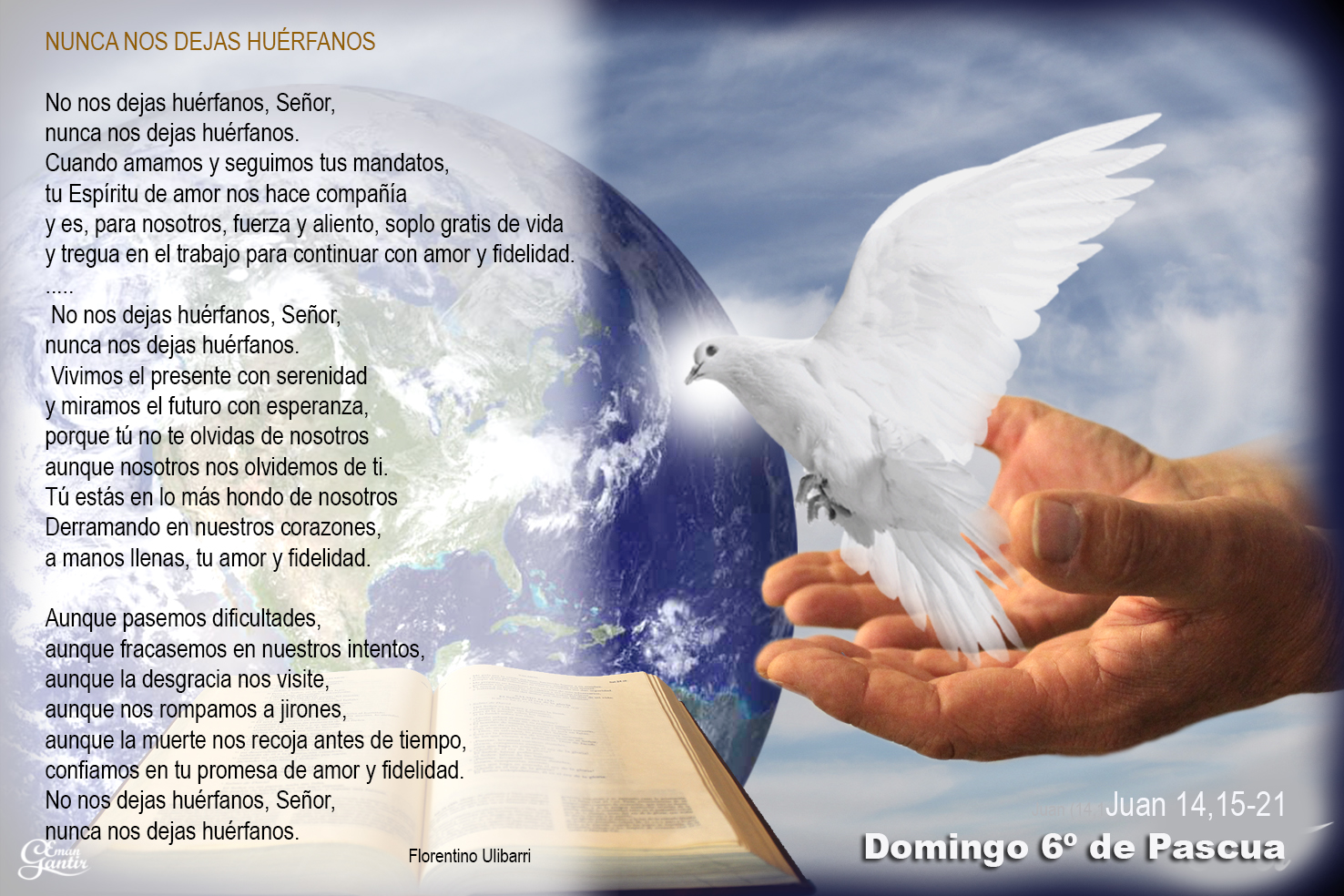En aquel tiempo, dijo Jesús a sus discípulos: «Si me amáis, guardaréis mis mandamientos. Y yo le pediré al Padre que os dé otro Paráclito, que esté siempre con vosotros, el Espíritu de la verdad. El mundo no puede recibirlo, porque. no lo ve ni lo conoce; vosotros, en cambio, lo conocéis, porque mora con vosotros y está en vosotros. No os dejaré huérfanos, volveré a vosotros. Dentro de poco el mundo no me verá, pero vosotros me veréis y viviréis, porque yo sigo viviendo. Entonces sabréis que yo estoy en mi Padre, y vosotros en mí y yo en vosotros. El que acepta mis mandamientos y los guarda, ese me ama; y el que me ama será amado por mi Padre, y yo también lo amaré y me manifestaré a él».