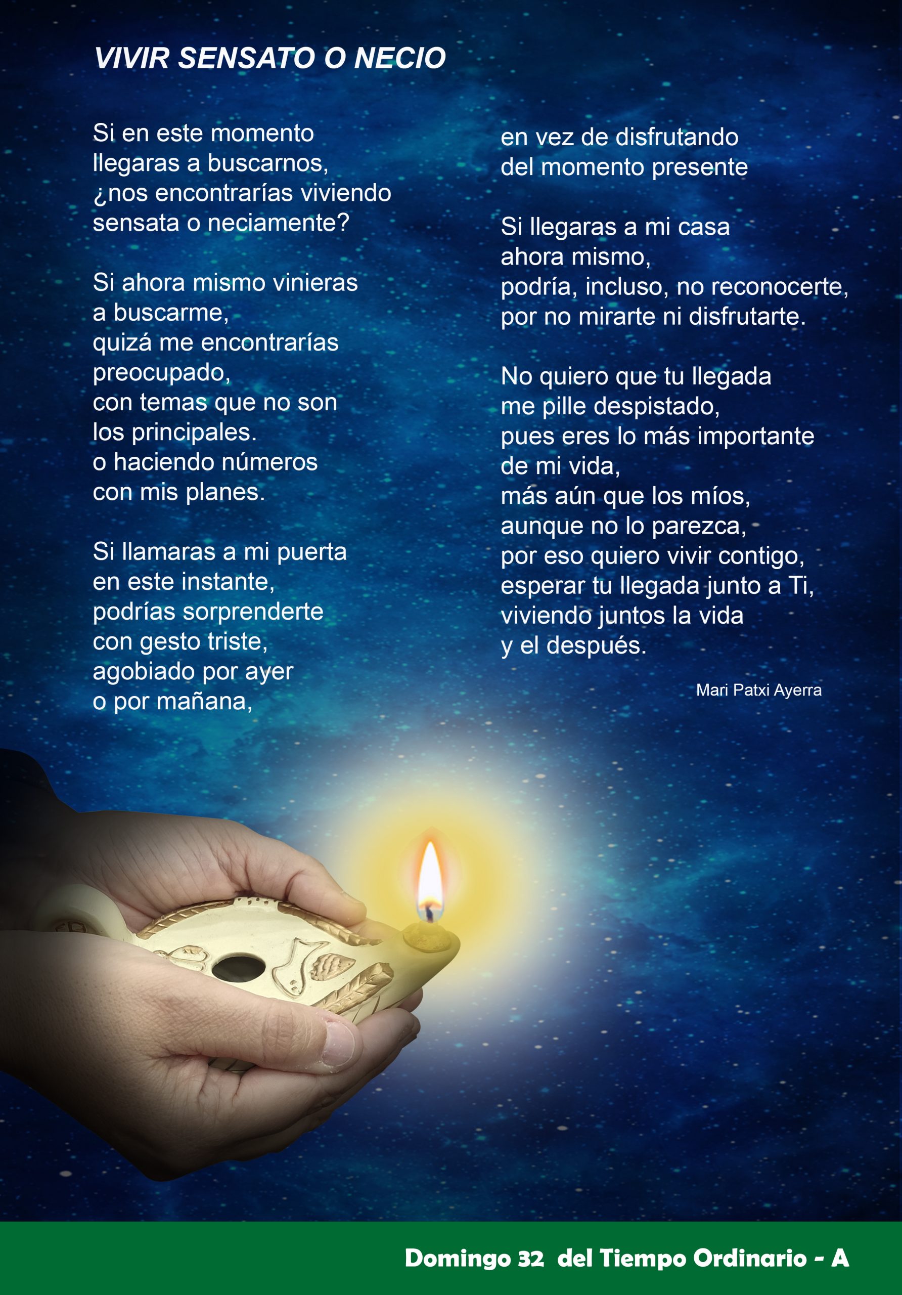 La conclusión de la parábola es desconcertante: «Por tanto, estad en vela, porque no sabéis el día ni la hora». Es desconcertante, porque ninguna de la diez ha velado, todas se quedaron dormidas. Lo cual significa que la vigilancia, en este caso, equivale a la sensatez de llevarse la provisión de aceite. ¿Qué significa esto en la práctica?